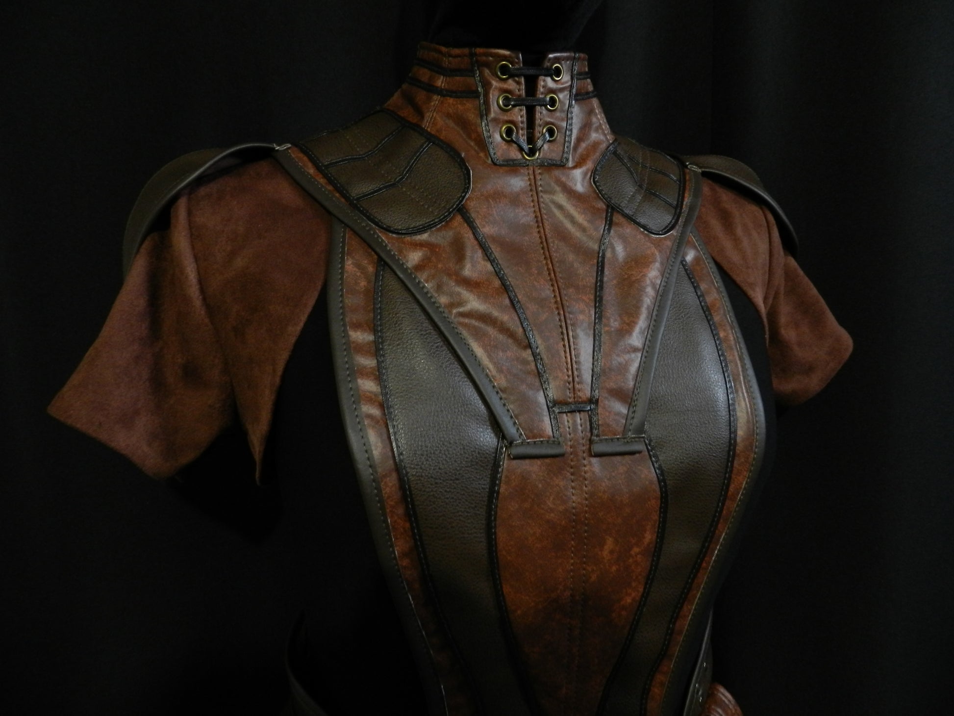 This hand-made armor costume is made from 2 shades of brown, with faux leather.
